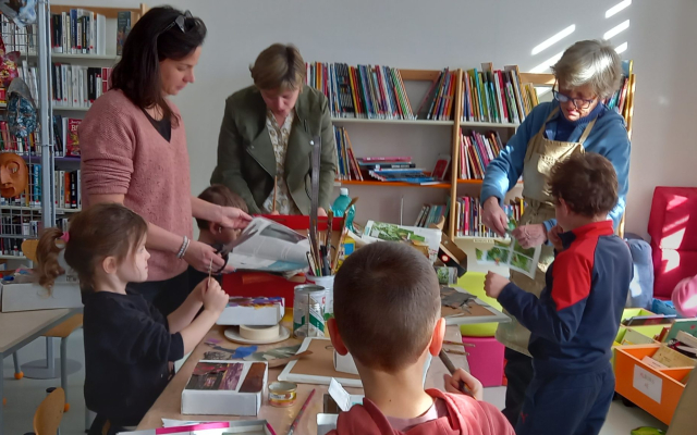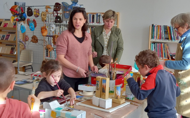 Animation masques et collages par deux artistes apinacoises : Hélène et Monique.